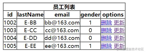 这里仍然采用拼接的方式@{/employee/} + ${employee.id},这样 thymeleaf 才可以正确解析。