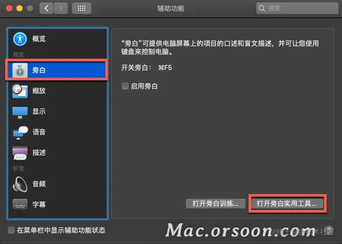 若要在 Mac 上打开“旁白实用工具”,请执行以下一项操作: