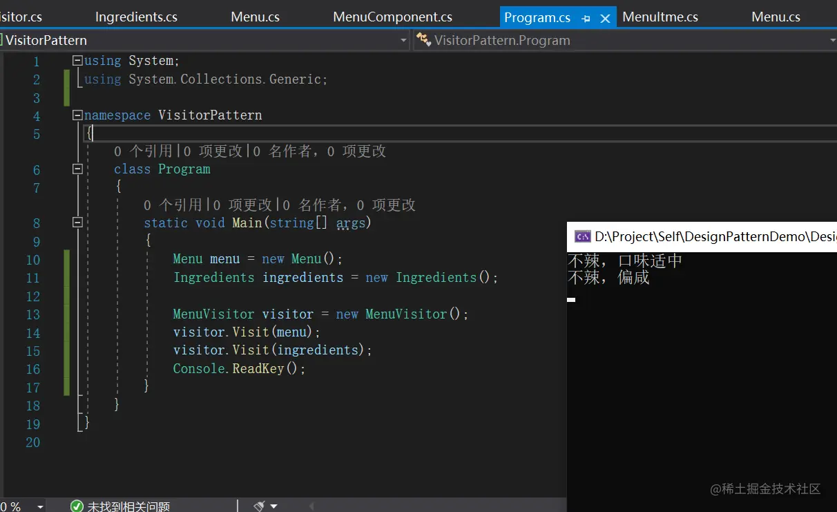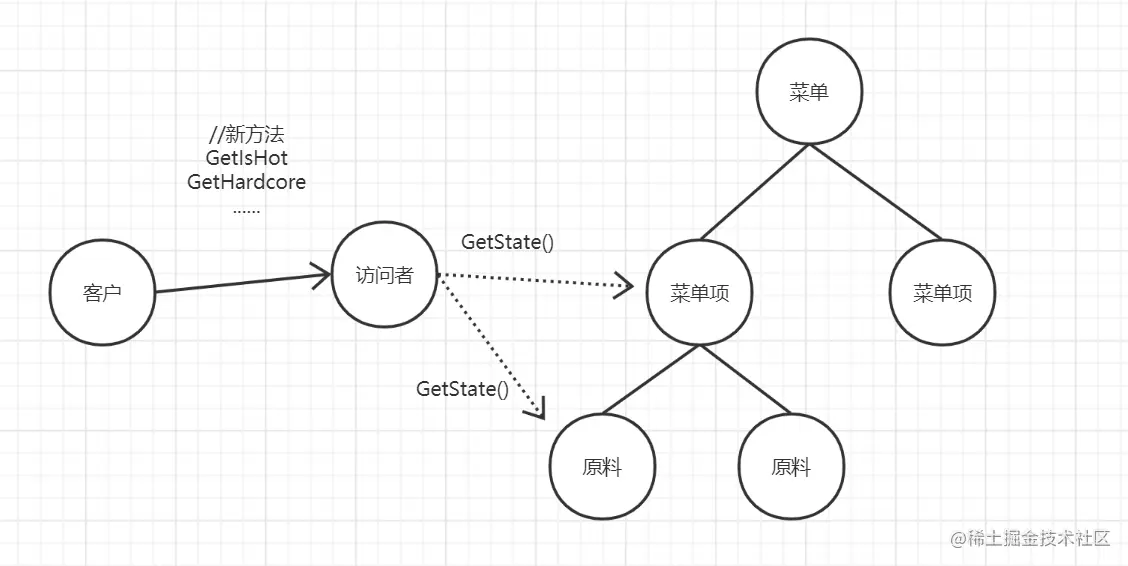 我们像这样设计在每个地方加入新方法,如果增加了新方法我们就必须在两个地方加入新方法,万一多了新的菜单我们就必须修改三个地方。这种情况我们就可以使用访问者模式。通过访问者访问组合内的每个元素,收集组合中所有对象的状态。一旦状态被收集了,客户就可以让访问者对状态进行各种操作。当需要新的功能时,只要加强访问者即可。