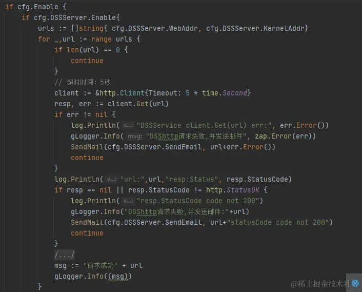 具体的检测逻辑,判断接口请求返回状态码是否为200,参考代码如下:
