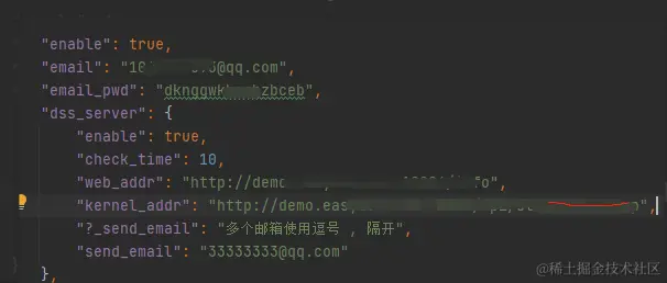 于是就这个需求,我们开始了测试。以EasyDSS为例,首先创建配置文件,enable参数为全局的开关、email和email_pwd为发送者的邮箱和授权码,dss_server中的设置为EasyDSS服务的检测配置,定时时间check_time单位是秒,web_addr&kernel_addr是用来请求web服务和kernel服务,返回状态是200则证明服务正常,反之,就发送邮件到send_email。