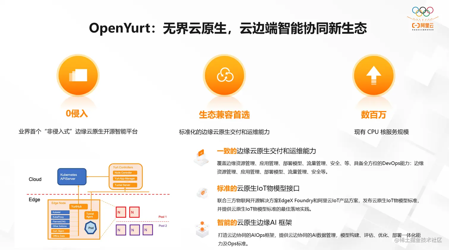 如今,越来越多的算力和业务开始下沉到距离数据源及终端用户更近的地方。随着规模、复杂度逐日攀升,边缘计算场景下的运维能力开始不堪重负。为了推动边缘计算和云原生领域协同发展,阿里云将边缘容器服务 ACK@Edge 核心框架 OpenYurt 向业界开源,并捐赠 CNCF 。秉持业界首创的 “非侵入式”理念,OpenYurt 拥有边缘计算全场景覆盖能力,成为生态兼容场景下的领域首选平台。其应用已覆盖包括 IoT、音视频、物流等数十个行业,让云原生变得无处不在。