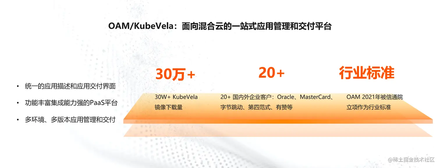 云原生最开始提出来的时候,是以资源集群管理与运维为切入点,但是今天如果要把所有的工作负载运行在一套基础设施之上,还缺乏对应用的管理。所以我们提出,以应用为中心,关注点分离,把开发运维基础设施、合作边界、协议、方法全部定义出来,也就是一站式应用管理与交付平台 KubeVela。今年 6 月,KubeVela 进入 CNCF Sandbox,目前镜像下载量突破 30 万次,拥有 20 多家全球企业客户。今年 OAM 也被信通院立项作为行业标准。
