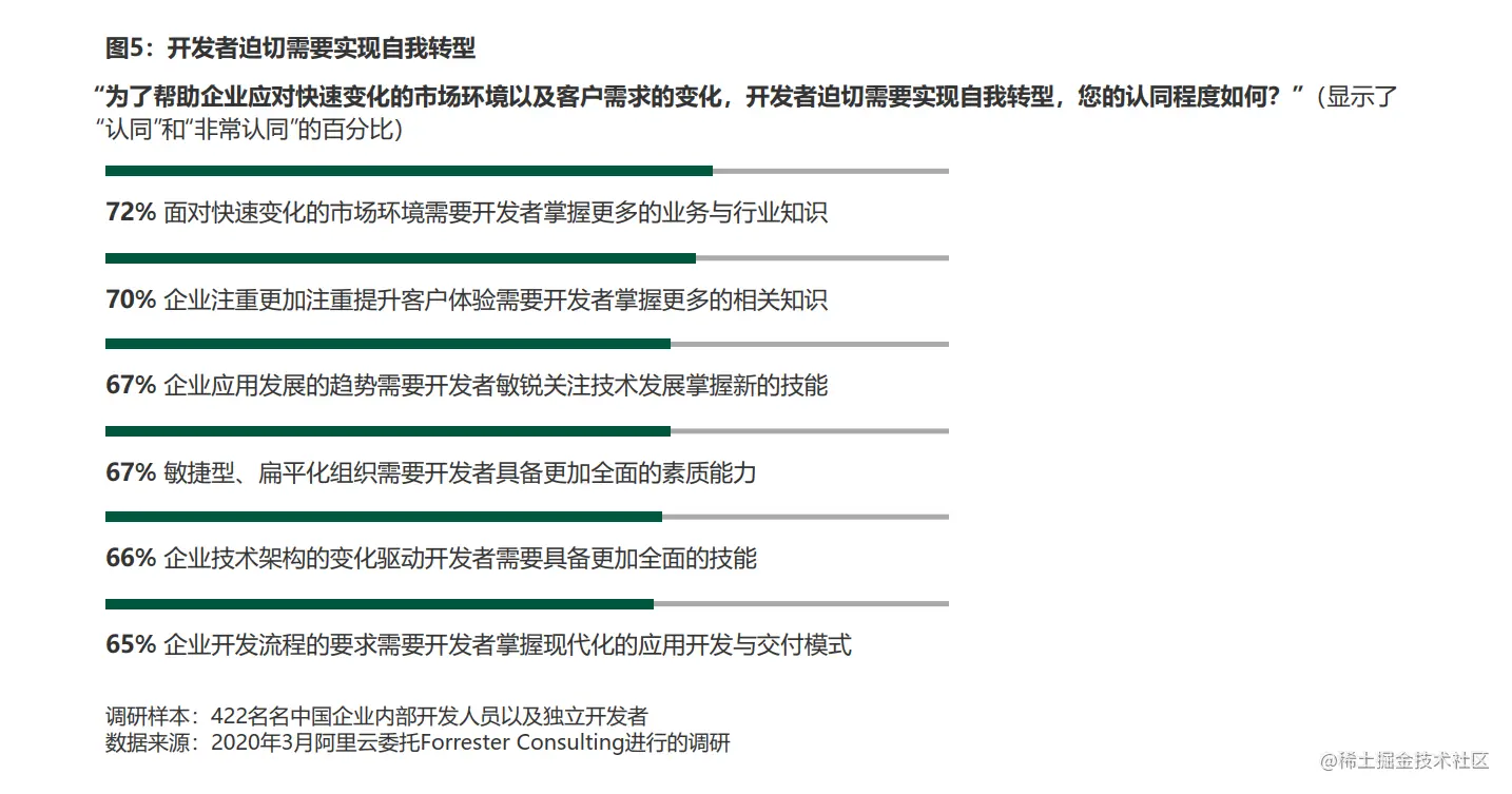 在调研过程中,72% 受访者反馈面对快速变化的市场环境,需要掌握更多的业务与行业知识,70% 的受访者认为随着企业愈来愈注重客户体验,需要开发者掌握相关的客户体验知识。不仅如此,各种内外部因素均对开发者的技能及素质提出了更高的要求,迫切要求开发者加速自我转型。