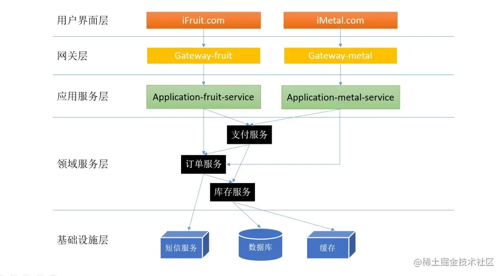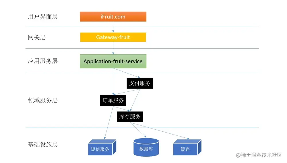 这里重点说明应用服务层和领域服务层之间的关系。举一个我经常跟部门其他开发举的一个例子:有一家上市企业A公司,靠卖水果发家,其首席架构师科学合理的按照DDD搭建了一套基于微服务体系的卖水果应用,其架构图如下: