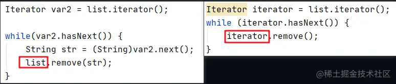 以上为程序反编译后的结果,我们可以看到抛开 foreach 语法糖外衣内部的实现方式,使用 ArrayList 内部实现的 Iterator 去遍历,每次遍历前会判断是否存在下一个元素,如存在获取下一个元素进行 remove