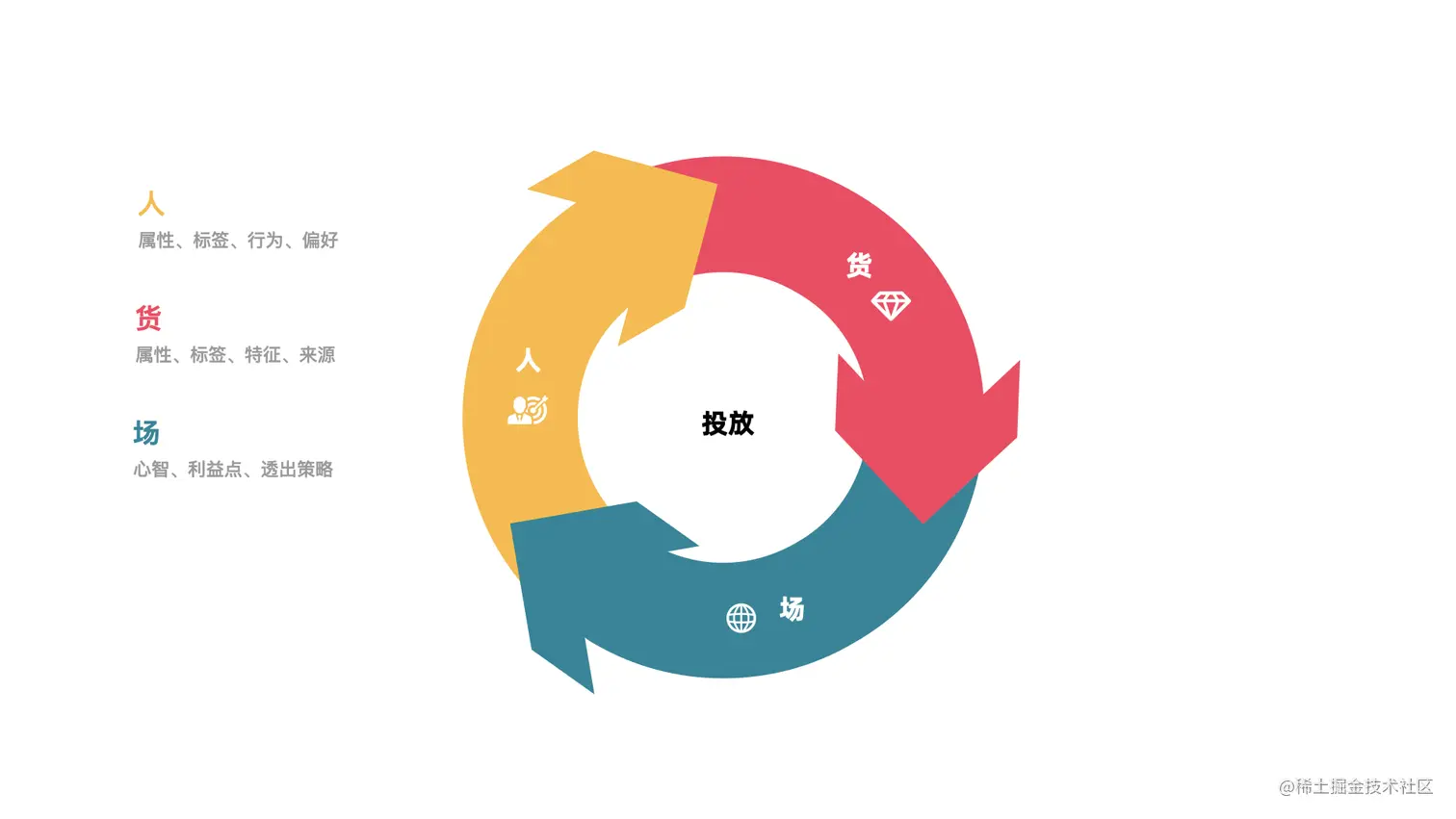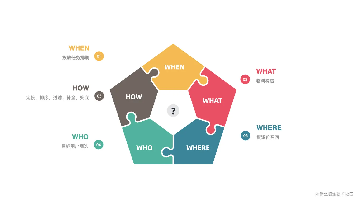 投放系统可以用4W1H模型来描述。即将合适的物料(What),在合适的时间(When),采用合适的策略(How),在合适的地方(Where),给到合适的人(Who)。该模型是投放系统的基础,我们所有的架构设计都围绕着这个模型推演。