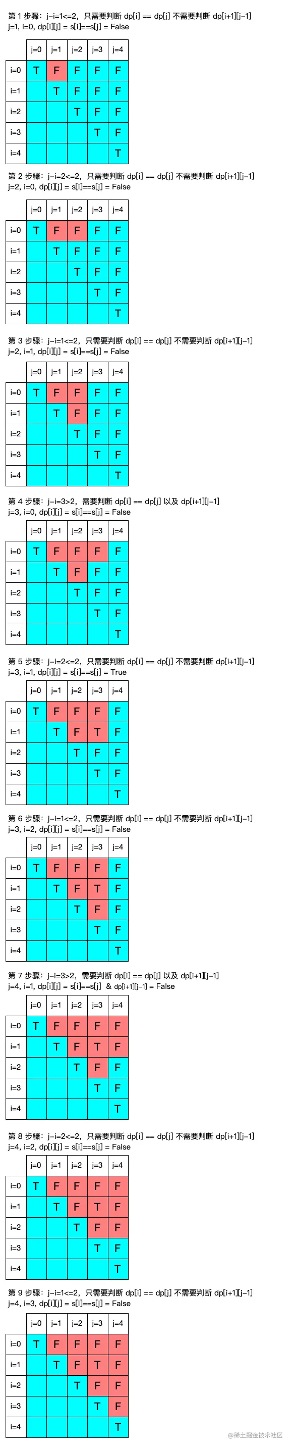 同时注意上面所说的,当 j-i<=2 的时候,只需要判断dp[i] == dp[j]不需要判断dp[i+1][j-1],因为当 j-i<=2 ,最多就 3 个字符,如果dp[i] == dp[j],可推理出肯定为回文。