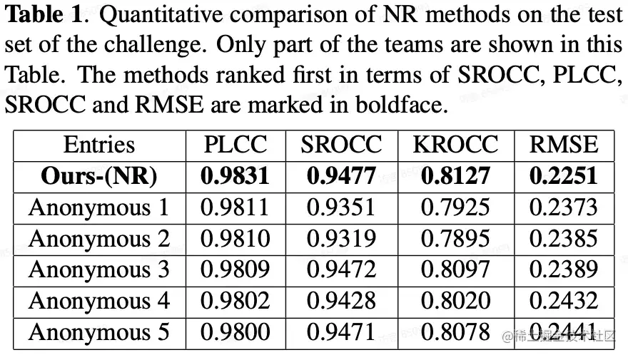 通过对比竞赛结果中的各队伍在测试集上的性能指标(PLCC/SROCC/KROCC/RMSE)以及 SOTA FR/NR 算法预测质量分数散点图,对提出模型的性能进行验证:
