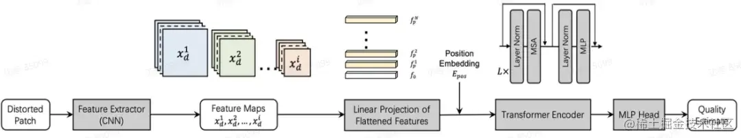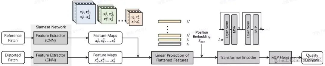 采用 CNN 提取局部特征,利用 Transformer 结构通过自注意机制预测主观质量分数。