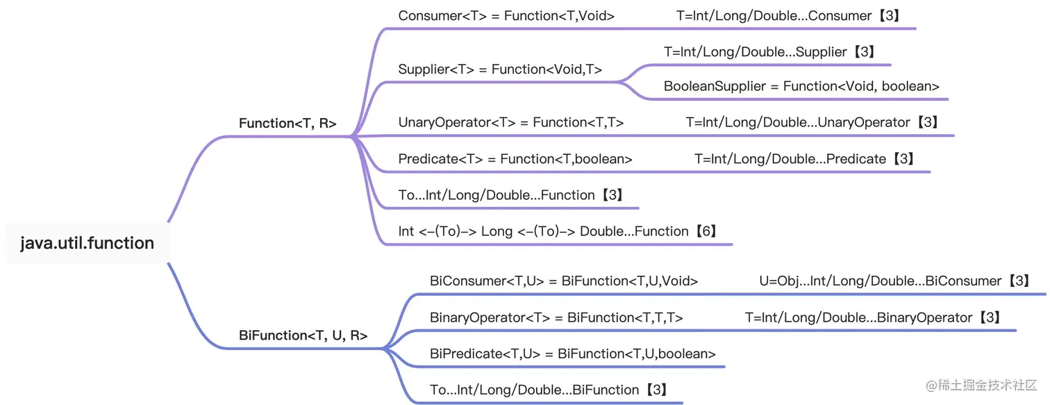 - 入参及返回值均为基础类型的扩展类:IntToDoubleFunction、IntToLongFunction、LongToIntFunction、LongToDoubleFunction、DoubleToIntFunction、DoubleToLongFunction。