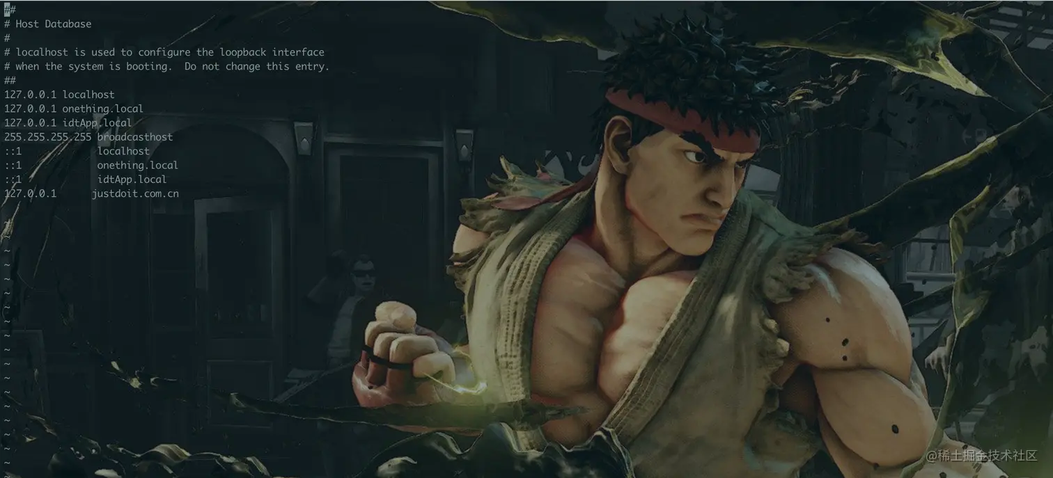 vhosts文件中添加127.0.0.1主机名,配置这个的作用就是将你配置的主机地址指向127.0.0.1(本机地址),sudo vim /etc/hosts个人设置如下: