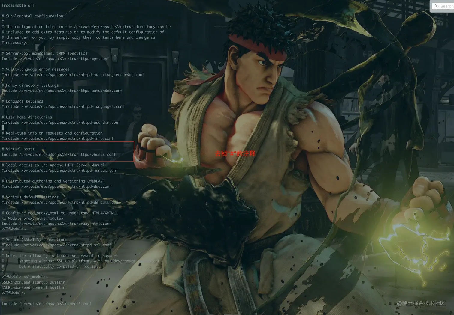 httpd.conf中找到#Include /private/etc/apache2/extra/httpd-vhosts.conf,去掉前面的#,保存并退出 -