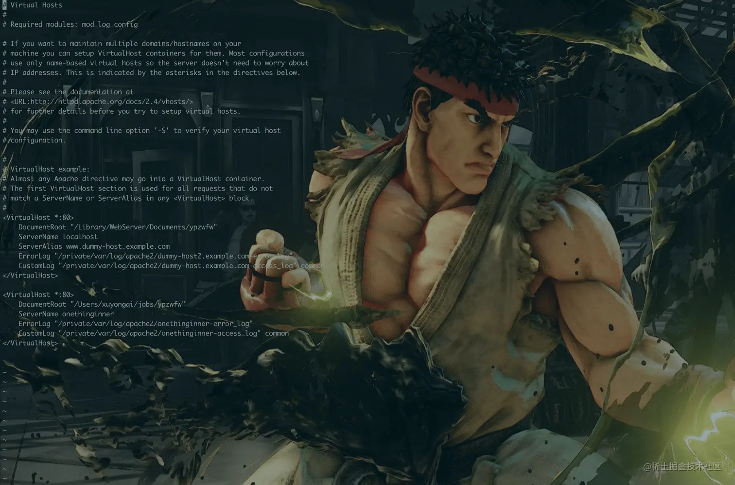 sudo vi /etc/apache2/extra/httpd-vhosts.conf,打开Apche的配置文件,如下图