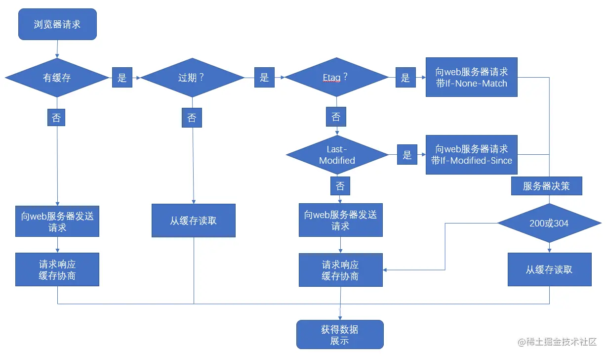 如果服务器收到的请求没有 Etag 值,则将 If-Modified-Since 和被请求文件的最后修改时间做比对,一致则命中协商缓存,返回 304;不一致则返回新的 last-modified 和文件并返回 200