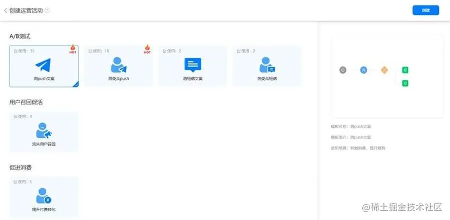 华为智能运营提供A/B测试,可以选择“测push文案”进行测试,并根据最终测试结果选择效果最好的文案用于运营活动创建。