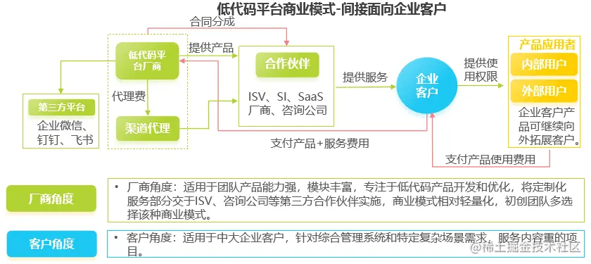 第一种商业模式为低代码平台厂商直接面向企业客户,针对企业客户的不同需求提供产品和服务,企业的通用性需求可以通过提供低代码平台产品给企业端专业研发人员或业务人员自行开发,当通用模块无法满足企业特定需求时,可以通过低代码平台厂商进行定制化解决方案沟通,通过产品+实施服务满足企业需求。