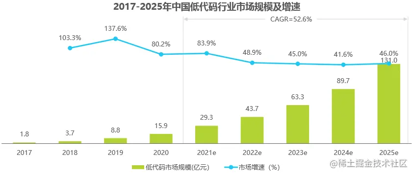 低代码市场规模预计2025年达到131亿,未来5年复合增速为52.6%