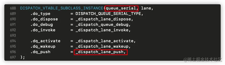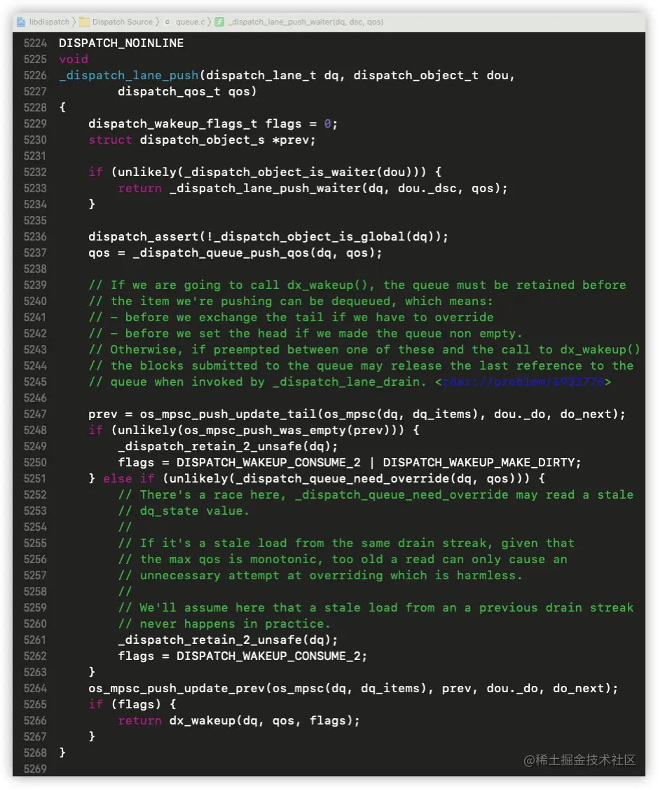 在_dispatch_lane_concurrent_push的方法实现中,我们发现调用了_dispatch_lane_push,而在串行队列的时候,dq_push也是被赋值为_dispatch_lane_push;