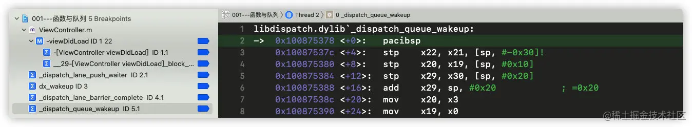 继续运行工程,发现符号断点_dispatch_queue_wakeup被执行: