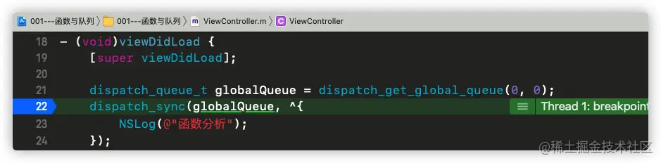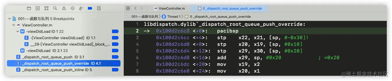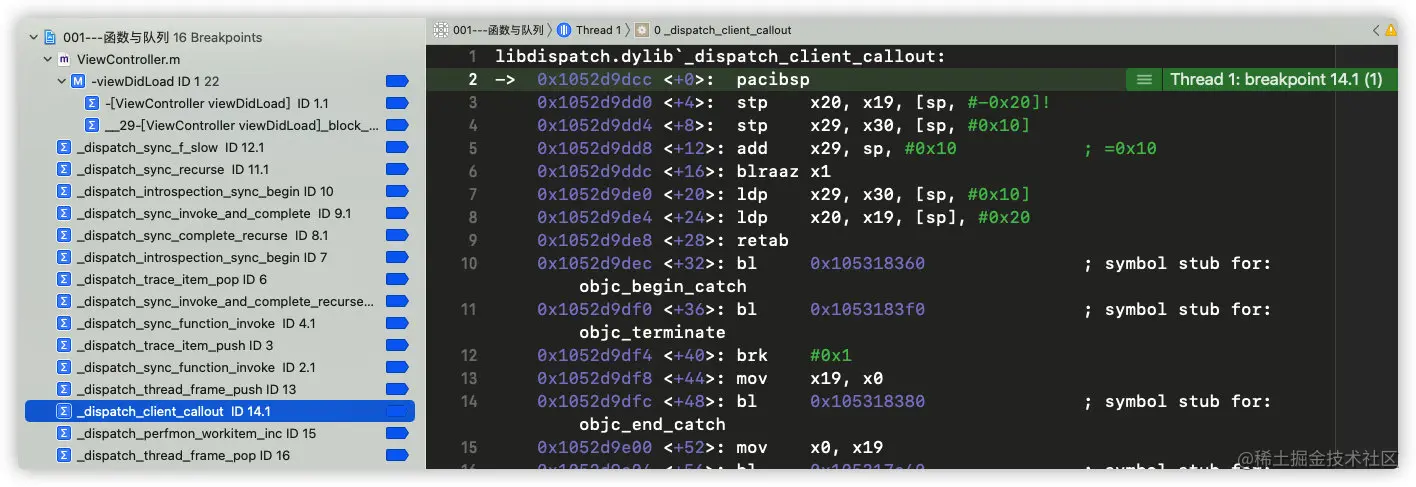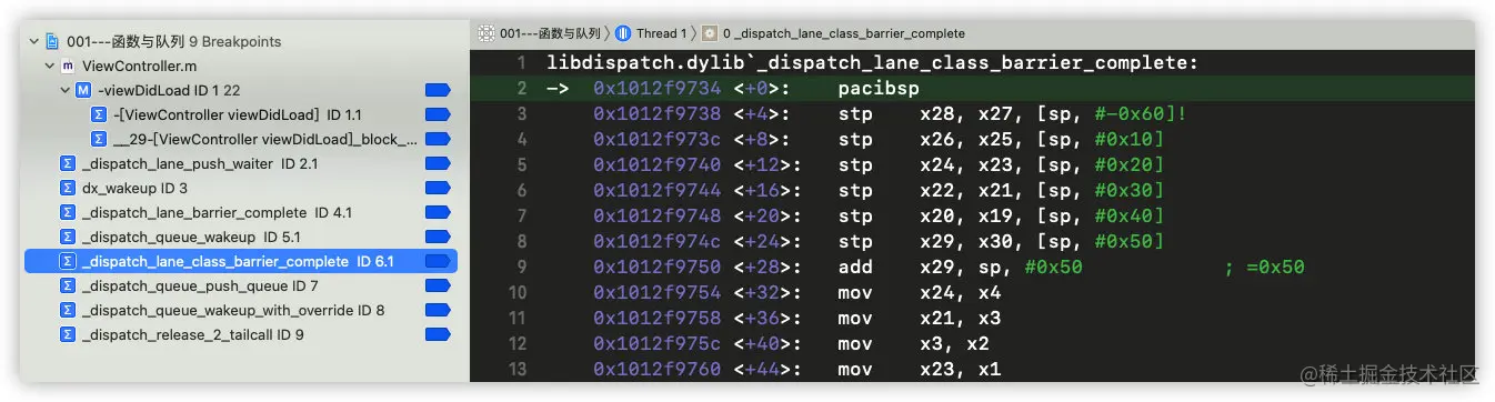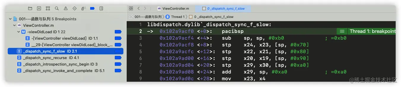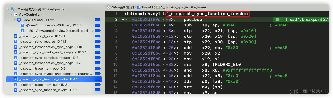 继续运行代码,发现进入符号断点_dispatch_sync_function_invoke: