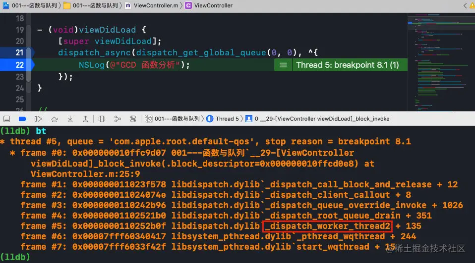 在GCD任务执行的堆栈中我们找到了_dispatch_worker_thread2;而_dispatch_worker_thread2是由底层_pthread_wqthread调起的;