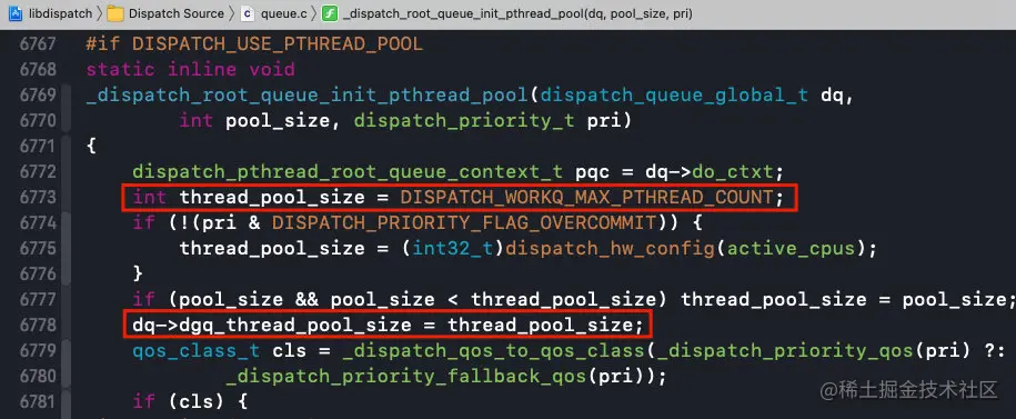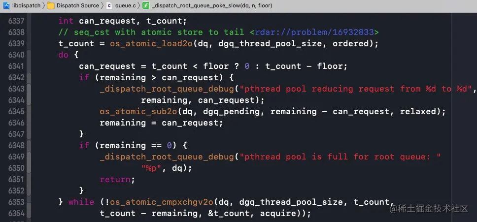 remaining当前空余的数量;是从上一个方法传进来的,通过方法调用往回查找发现它是1;这是因为全局并发队列进来的一次,只创建一个线程;当remaining进行--remaining之后,最终为0,标明当前线程池满员;can_request能够请求到的数量;floor是从之前的方法中传过来的,我们可以通过方法调用往回查找发现它是0;(一般情况下,floor是0或1)t_count是通过os_atomic_load2o获取到的,并且和dgq_thread_pool_size有关系;dgq_thread_pool_size会不断被赋值(通过os_atomic_inc2o进行++操作不断变大)dgq_thread_pool_size线程池大小;他会被赋值为thread_pool_size,而thread_pool_size的大小等于DISPATCH_WORKQ_MAX_PTHREAD_COUNT也就是255;