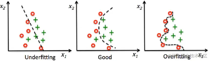 描述模型拟合(学习)程度常用欠拟合、拟合良好、过拟合,我们可以通过训练误差及测试误差评估模型的拟合程度。从整体训练过程来看,欠拟合时训练误差和测试误差均较高,随着训练时间及模型复杂度的增加而下降。在到达一个拟合最优的临界点之后,训练误差下降,测试误差上升,这个时候就进入了过拟合区域。