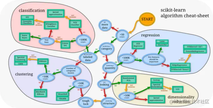 ####特征降维 如果特征选择后的特征数目仍太多,这种情形下常会有数据样本稀疏、距离计算困难的问题(称为 “维数灾难”),可以通过特征降维解决。常用的降维方法有:主成分分析法(PCA)等。 ##3 模型训练 模型训练是利用既定的模型方法去学习数据经验的过程,这过程还需要结合模型评估以调整算法的超参数,最终选择表现较优的模型。 ###3.1 数据集划分 训练模型前,常用的HoldOut验证法(此外还有留一法、k折交叉验证等方法),把数据集分为训练集和测试集,并可再对训练集进一步细分为训练集和验证集,以方便评估模型的性能。 ① 训练集(training set):用于运行学习算法,训练模型。 ② 开发验证集(development set)用于调整超参数、选择特征等,以选择合适模型。 ③ 测试集(test set)只用于评估已选择模型的性能,但不会据此改变学习算法或参数。 ###3.2 模型方法选择 结合当前任务及数据情况选择合适的模型方法,常用的方法如下图 ,scikit-learn模型方法的选择。此外还可以结合多个模型做模型融合。
