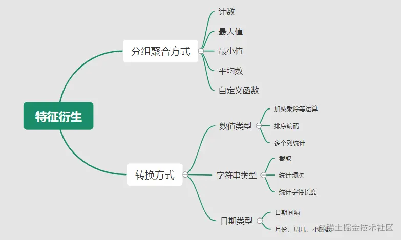 #####特征衍生 基础特征对样本信息的表达有限,可通过特征衍生可以增加特征的非线性表达能力,提升模型效果。另外,在业务上的理解设计特征,还可以增加模型的可解释性。(如体重除以身高就是表达健康情况的重要特征。) 特征衍生是对现有基础特征的含义进行某种处理(聚合/转换之类),常用方法人工设计、自动化特征衍生(图4.15): ① 结合业务的理解做人工衍生设计: 聚合的方式是指对字段聚合后求平均值、计数、最大值等。比如通过12个月工资可以加工出:平均月工资,薪资最大值 等等; 转换的方式是指对字段间做加减乘除之类。比如通过12个月工资可以加工出:当月工资收入与支出的比值、差值等等;