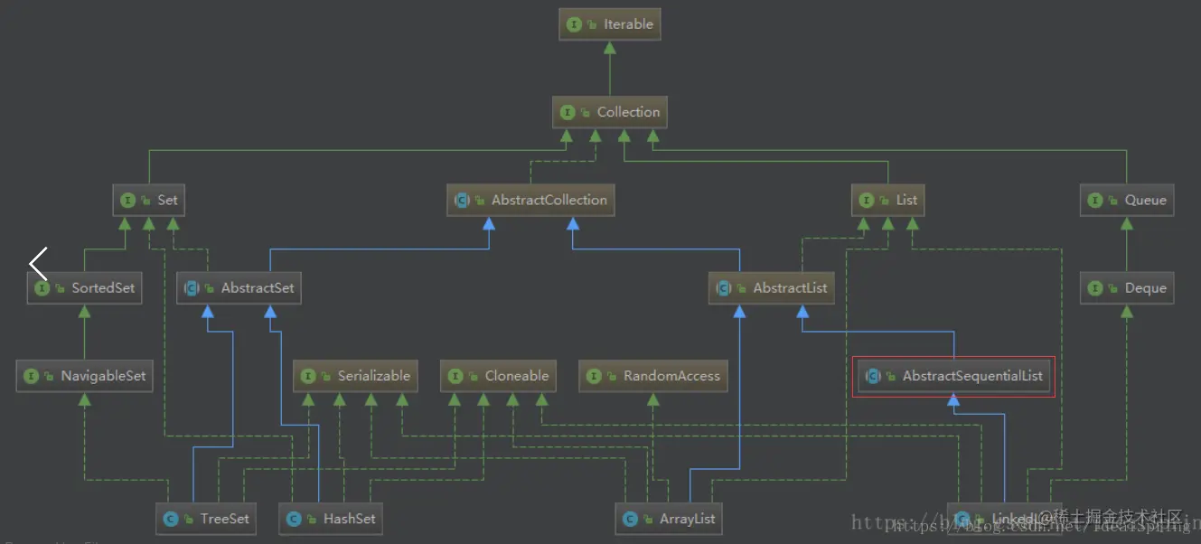 AbstractSequentialList继承了AbstractList,它是一个基于迭代器的抽象类,它只实现了最基本的增删改查方法,其中的所有的方法都需要根据迭代器来实现。能看出如果继承这个类,那么一定是和链表相关的类,如果是数组的话,也不能用效率这么低的Iterator来实现增删改查。