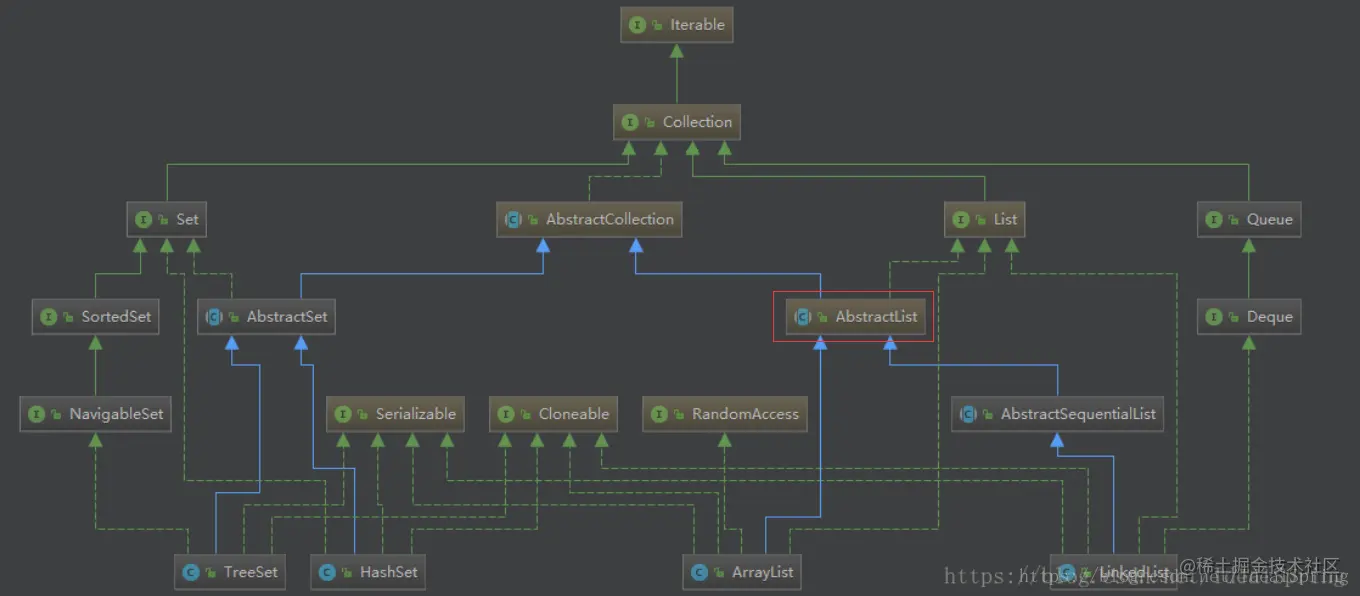 Collection集合体系有两大分支,一个是List分支、另一个是Set分支,Collection是这两大分支超类;这两个分支都由接口去约束,每个几口都有其实现类,而AbstractList抽象类就是List分支的顶层超类。此类提供了List接口的骨干实现,以最大限度地减少实现由“随机访问”数据存储(例如数组、链表)支持的此接口所需的工作量。此类是针对线性表结构。