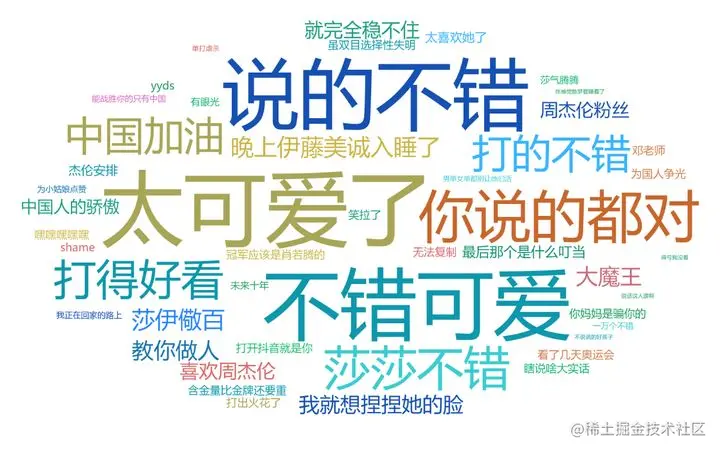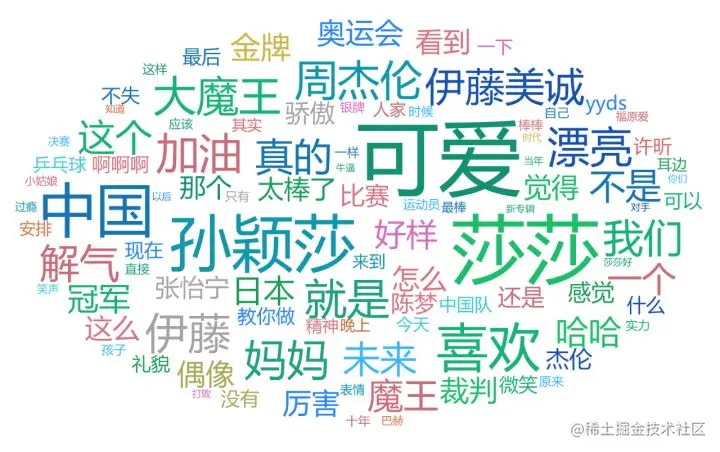 TOP20的高频词分别是:可爱、莎莎、孙颖莎、中国、喜欢、周杰伦、漂亮、妈妈、加油、大魔王、伊藤美诚、解气、真的、未来、冠军、好样的、日本、金牌、偶像、厉害。