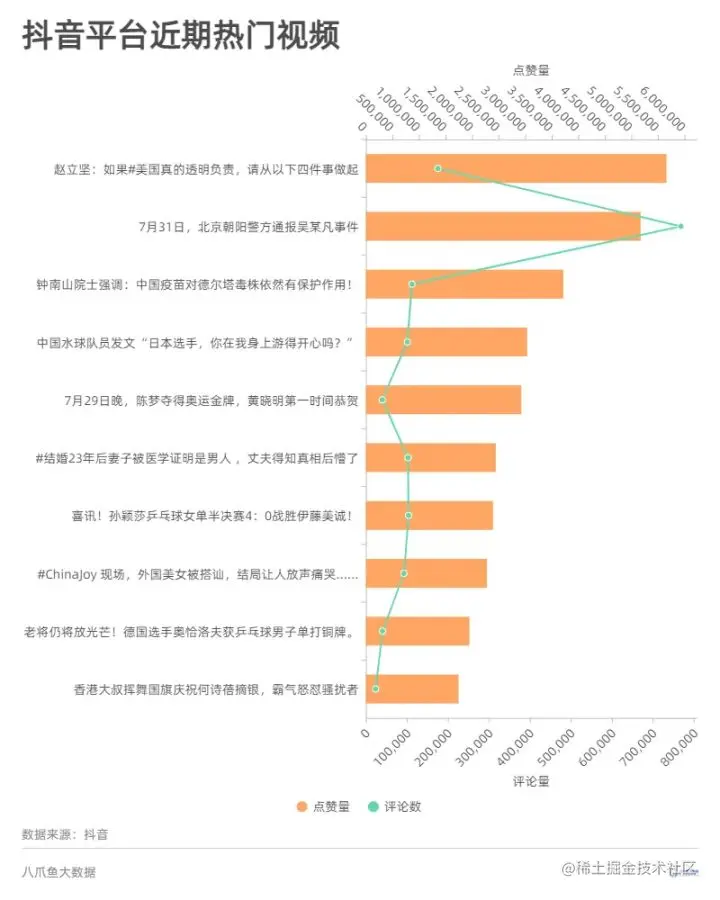 我们采集了抖音平台10个新闻媒体从7月23日至8月3日发布的1027条视频数据,包括环球网、中国日报、新华每日电讯等。从中分析近期的新闻热度及网友讨论情况。