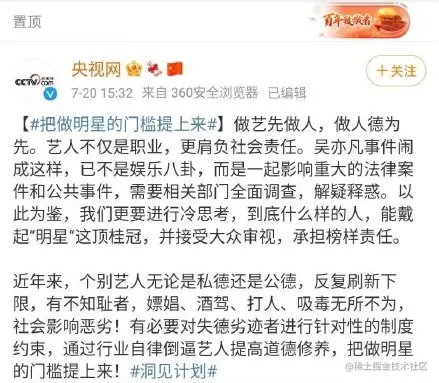 7月20日下午3点,央视网发布微博#把做明星的门槛提上来#,官方下场给这件事盖章。