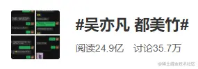 截止至发稿前,微博上#吴亦凡 都美竹#的话题已经收获了35.7万讨论和24.9亿阅读,而这仅仅是单个话题的阅读量,不包括品牌方和其他女生相关信息。