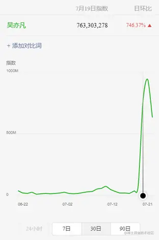 7月18日,都美竹在微博上发布与吴亦凡的"决战宣言”,一时之间,与吴亦凡相关的话题引爆了各大社交平台。据微信指数小程序显示,7月19日当天,吴亦凡的微信指数日环比暴涨746%,热度指数超过7千万。