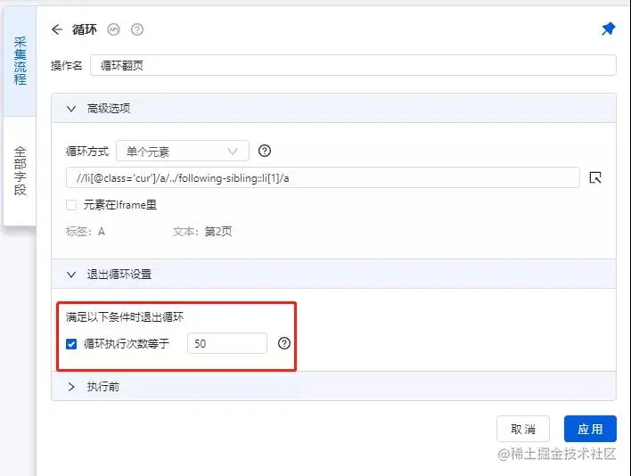 修改循环执行次数(上限不能超过50页),并点击应用;