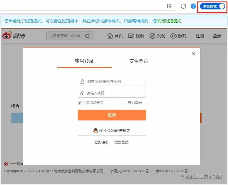 因为微博必须要登录才能看得到更多的数据,所以登录是我们要做的第一步。先点击第一步打开网页,在采集界面中打开浏览模式,选择账号或扫码登录微博;