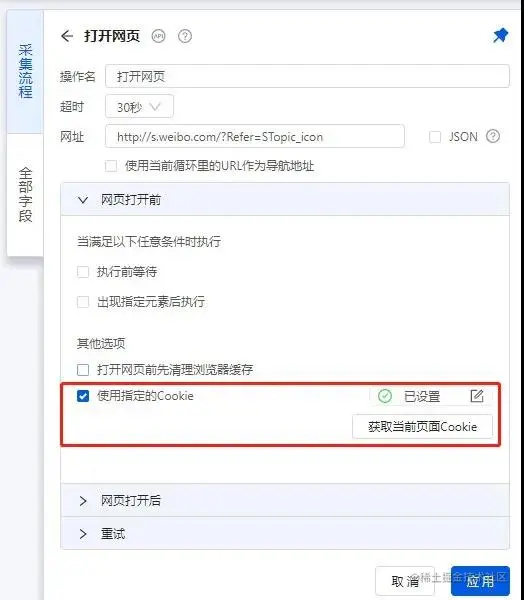 登录完成后,在打开网页的步骤设置中选择使用指定的cookie,获取当前页面的cookie并应用