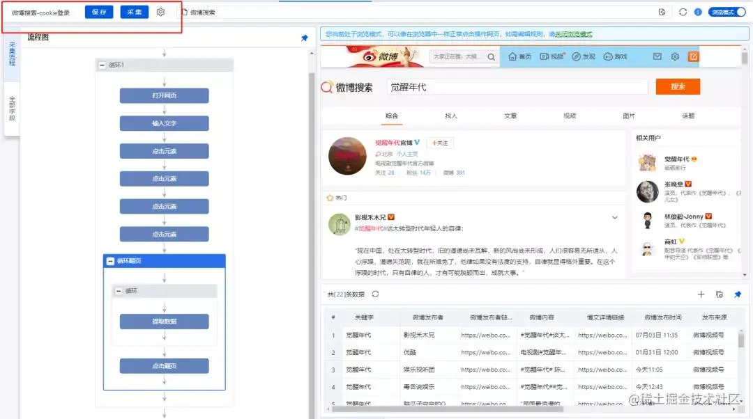 第2步 输入**#觉醒年代#**关键词获得搜索结果 如果需要搜索其他关键词(一个或多个),可以打开循环1的步骤设置界面