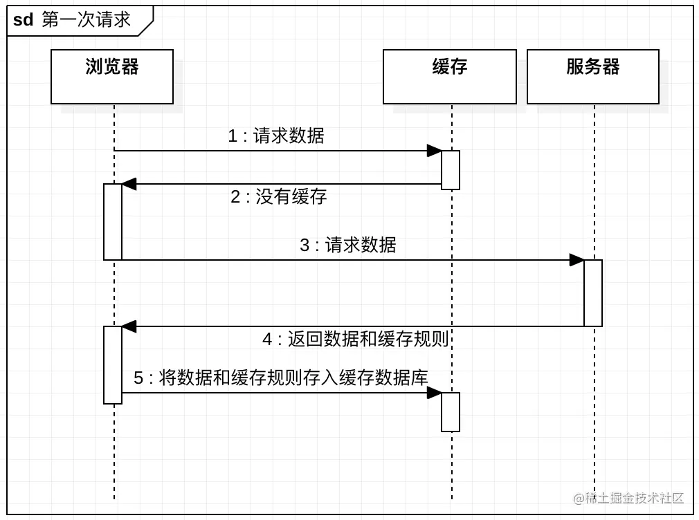 缓存机制的类型是由服务端告知浏览器的,第一次数据请求浏览器在缓存库里没找到缓存数据就直接请求服务器,服务器会带上响应数据和缓存规则一起返回给浏览器,浏览器将其存储就完成里第一次缓存。