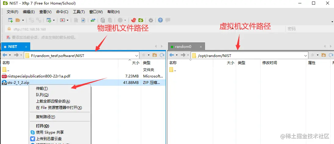 物理机与虚拟机选择相应的文件路径,将右键压缩包,将压缩包传输到虚拟机上,右边出现压缩包即为传输成功