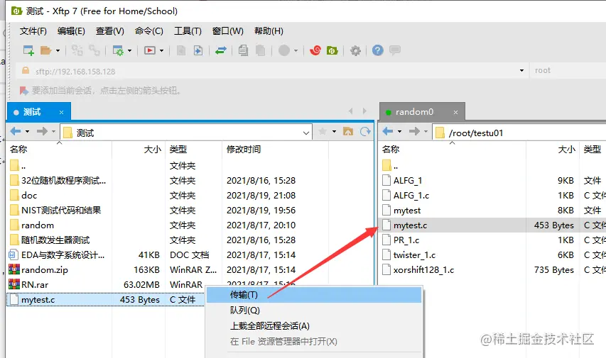 **方法1:**在电脑上写好测试程序,通过Xftp传输到测试文件夹/root/testu01