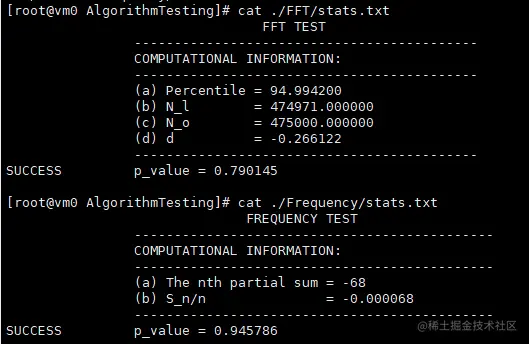 每个子项目目录下都有stats.txt 文件中描述的是P-value值,在ALPHA = 0.0100条件下(默认值),这个值大于0.01就表示通过测试,是随机的。