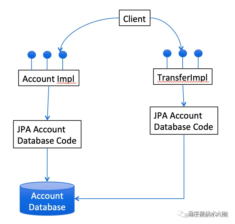 很快,团队就发现 Account 上有一些定义良好的操作:借、贷、开、关。幸运的是,这些操作可以很好地映射到 REST 接口,因此,采用这种简单的基于实体的设计并将其映射到微服务实现起来比较容易。然而,很快他们就发现了问题——他们还没有弄清楚账户之间如何进行转账,如下图所示: