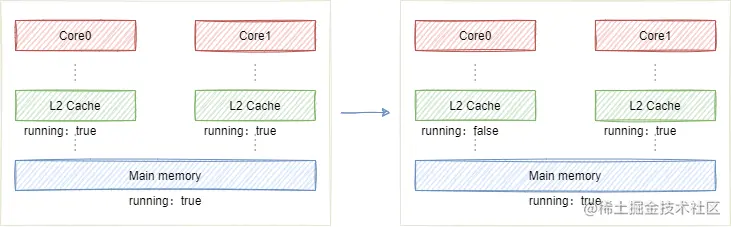 上面的代码,core0和core1读取running到缓存中,并使用了running变量。但后面core0修改running为false,这个修改仅影响了core0的缓存,并没有写入main memory,导致对core1不可见。