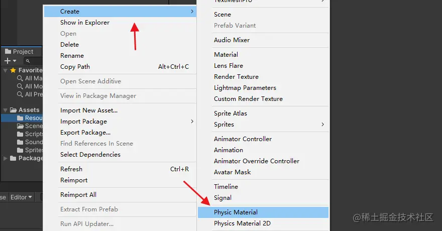 要创建物理材质从Project面板中->Create->Physic Material。然后从Project面板中拖拽物理材质到场景上物体的碰撞器Material属性上。如图所示。