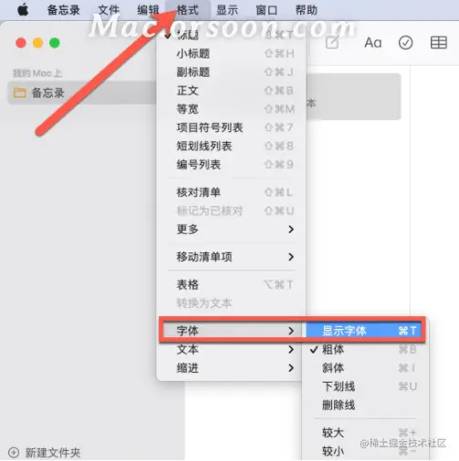 1.在 Mac 上的 App 中,选取“格式”>“显示字体”,或者“格式”>“字体”>“显示字体”。