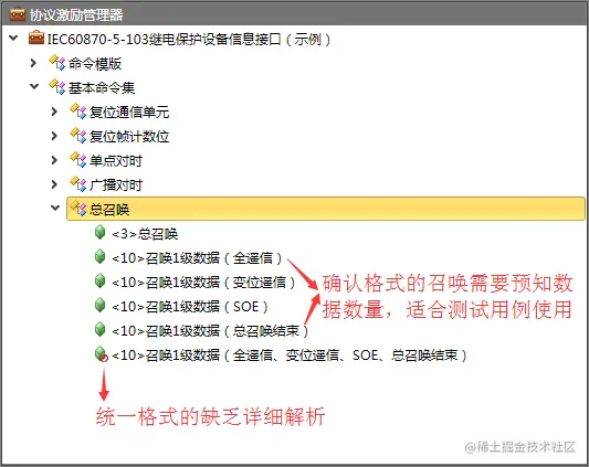 其次,通过复制和粘贴功能,从命令模版中把“<3>传送数据”复制到协议集“总召唤”中,作为发起总召唤命令,把“<10>召唤1级数据”复制过来作为召唤全遥信、变位遥信、SOE、总召唤结束命令。